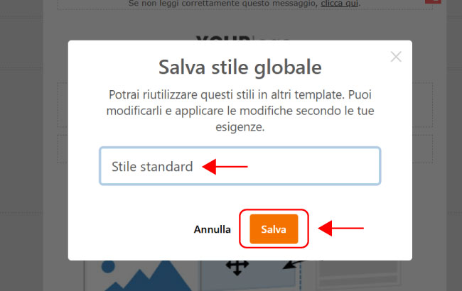 Si aprirà una finestra che ti chiederà di inserire un nome per lo stile. Dai un nome al tuo stile globale e clicca su Salva.