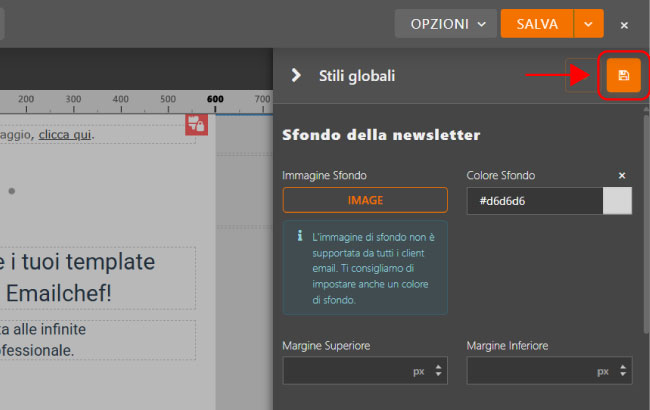Quando hai perfezionato l’aspetto della tua newsletter, puoi salvare la configurazione per riutilizzarla in futuro.