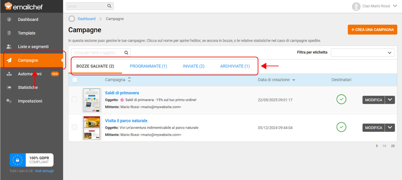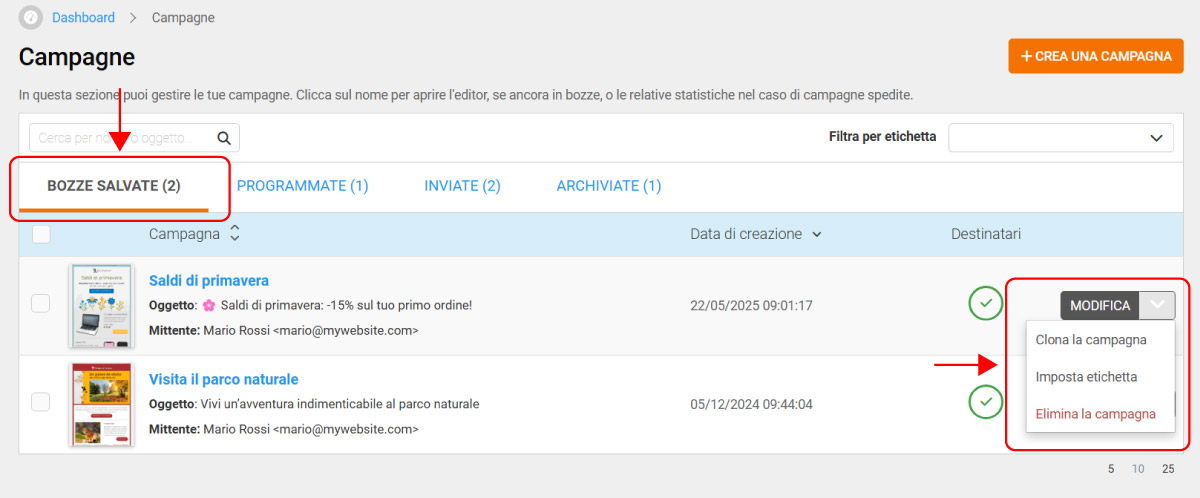- Bozze salvate → campagne in corso di creazione, salvate ma non ancora inviate.