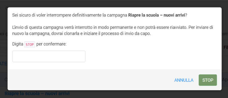 La nuova funzione Interrompi invio ti permette di interrompere immediatamente l’invio in corso di una campagna. Basta selezionare Interrompi invio, confermare digitando “STOP” e lo stato della campagna cambierà subito in Interrotta dall’utente.