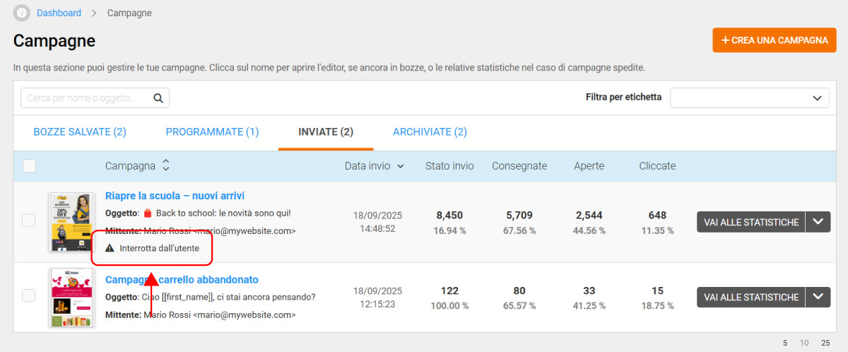 Questa opzione può essere utilizzata solo mentre l’invio è ancora in corso e non è più disponibile una volta che l’invio di una campagna è stato completato. Una volta fermata, la campagna resta contrassegnata in modo permanente come interrotta.