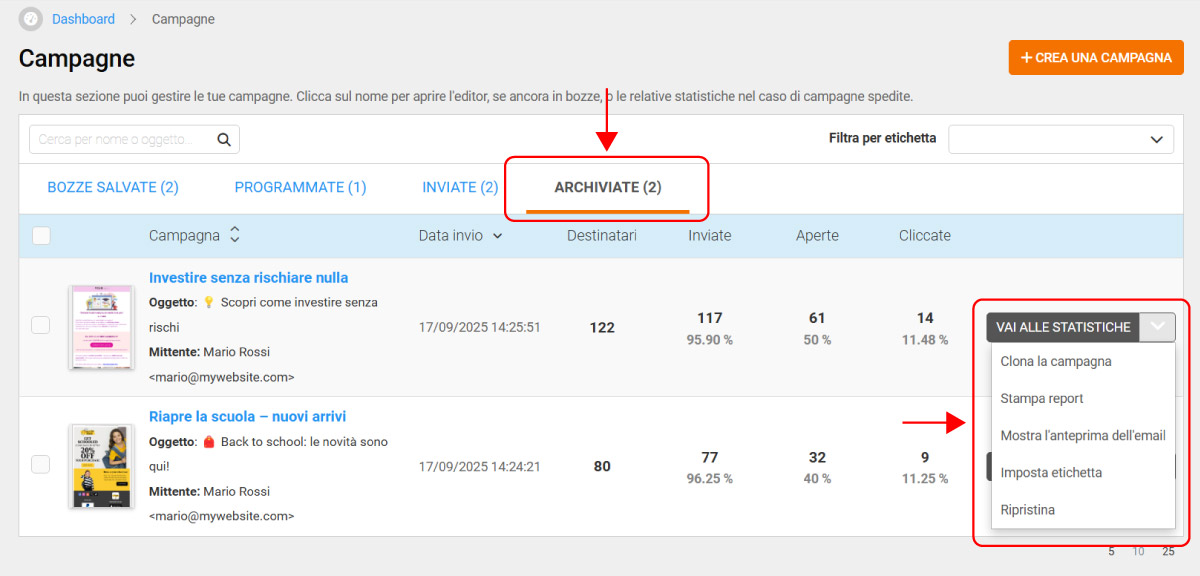 - Archiviate → campagne spostate dalla sezione Inviate quando non più necessarie.Sia le campagne inviate sia quelle interrotte durante l’invio possono essere archiviate e, in qualsiasi momento, riportate nella sezione Inviate.