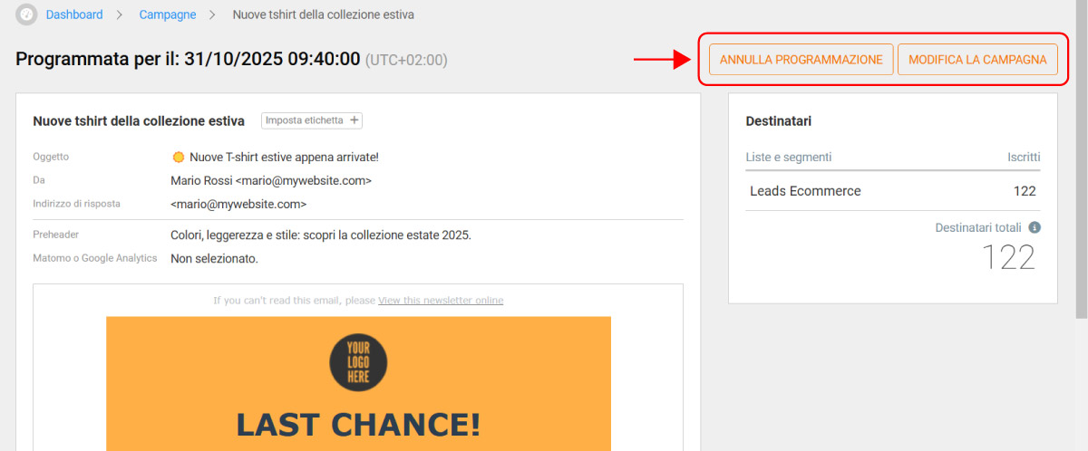- ANNULLA PROGRAMMAZIONE, per annullare l’invio programmato e spostare la campagna tra le Bozze salvate.