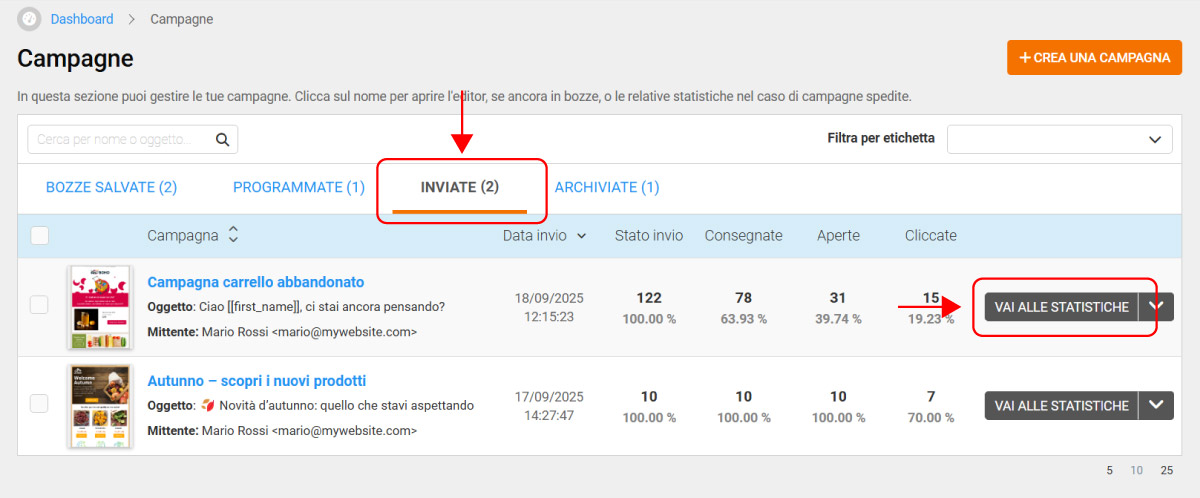 Per una panoramica completa sulle performance della tua campagna, clicca sul nome della campagna o sul pulsante VAI ALLE STATISTICHE per accedere a un report dettagliato con tutti i dati.