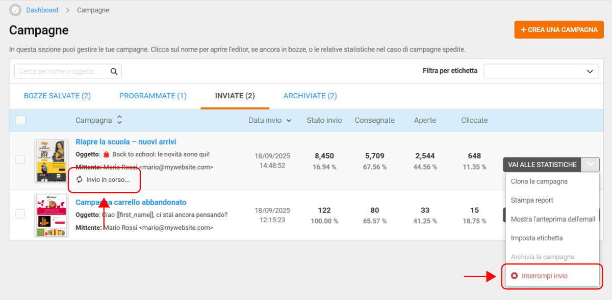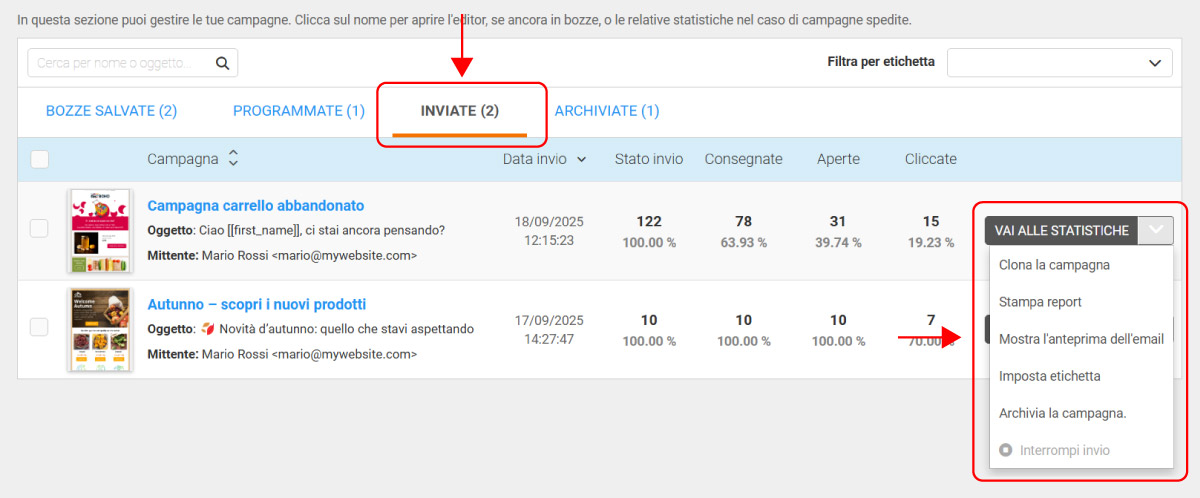 Puoi gestire ogni campagna inviata direttamente dal menù a tendina accanto al pulsante VAI ALLE STATISTICHE.