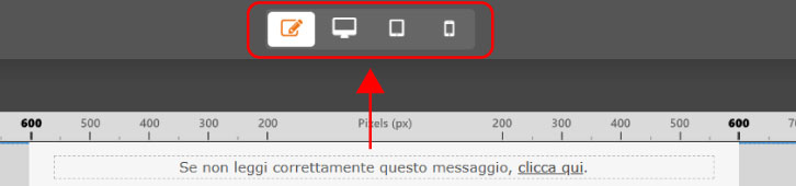 Al centro sono disponibili le icone per passare dalla modalità di modifica all’anteprima della newsletter su desktop, tablet o cellulare, in modo da verificare che il layout sia perfetto su tutti i dispositivi.