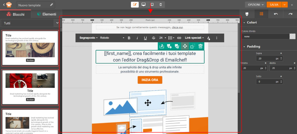 In questo modo puoi costruire e riorganizzare la tua email in modo completamente visuale e intuitivo.