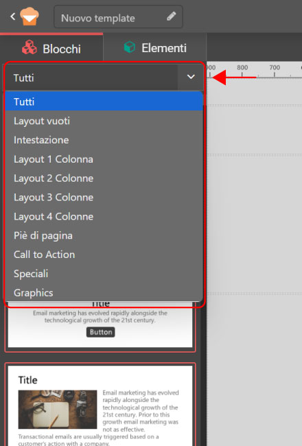 La libreria degli elementi contiene tutti i componenti che puoi inserire all’interno dei blocchi per costruire il contenuto della tua email.