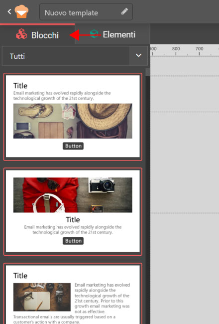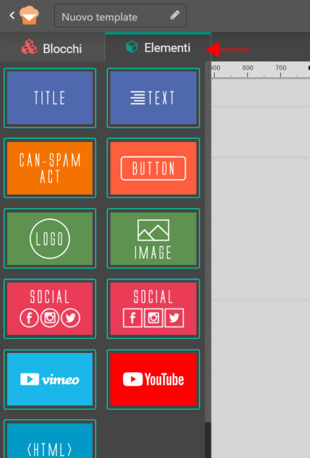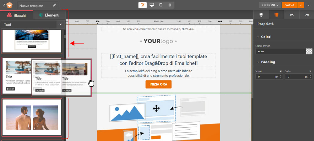 In questo modo puoi comporre la tua email combinando liberamente struttura (blocchi) e contenuto (elementi).