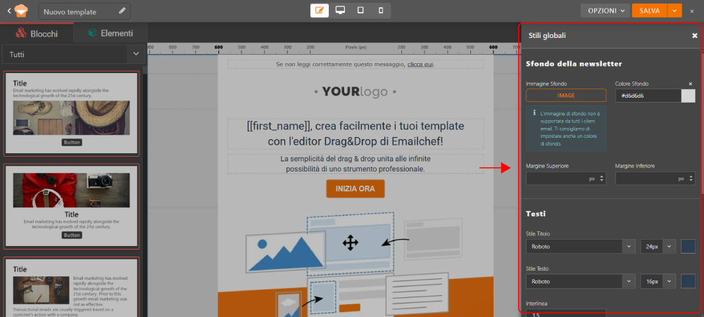 Il pannello degli Stili globali ti permette di definire l’aspetto grafico generale della newsletter, applicando impostazioni valide per l’intero template.
