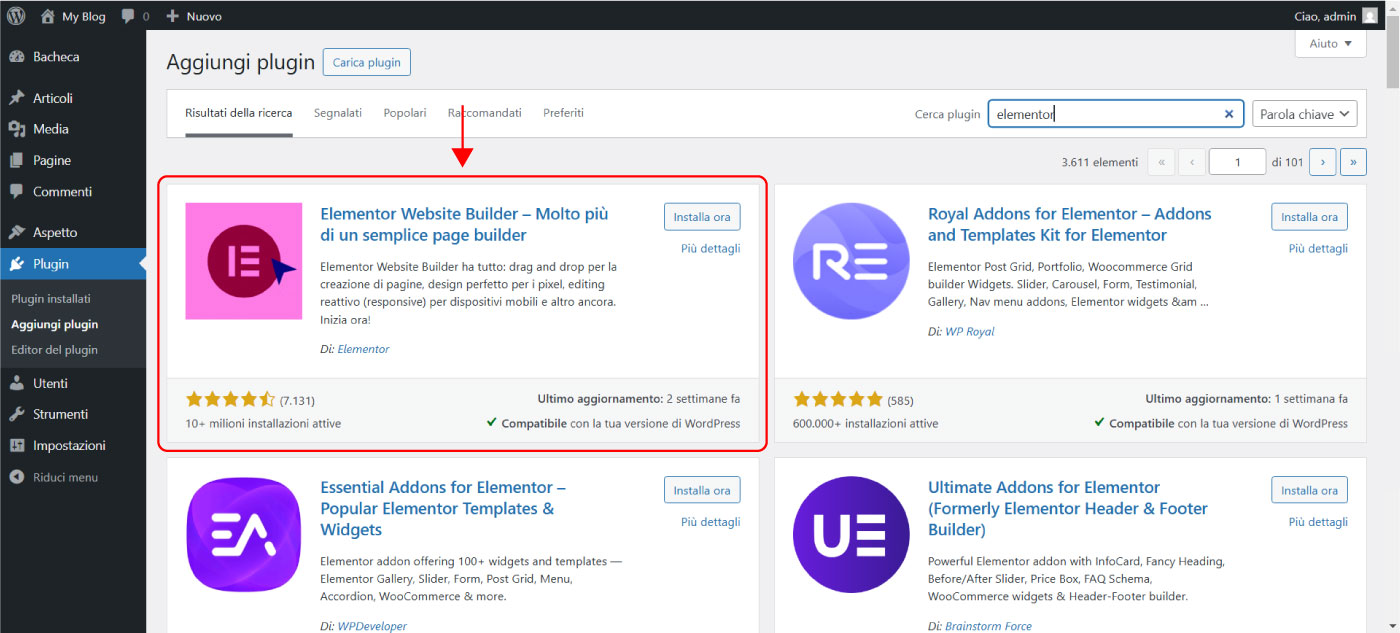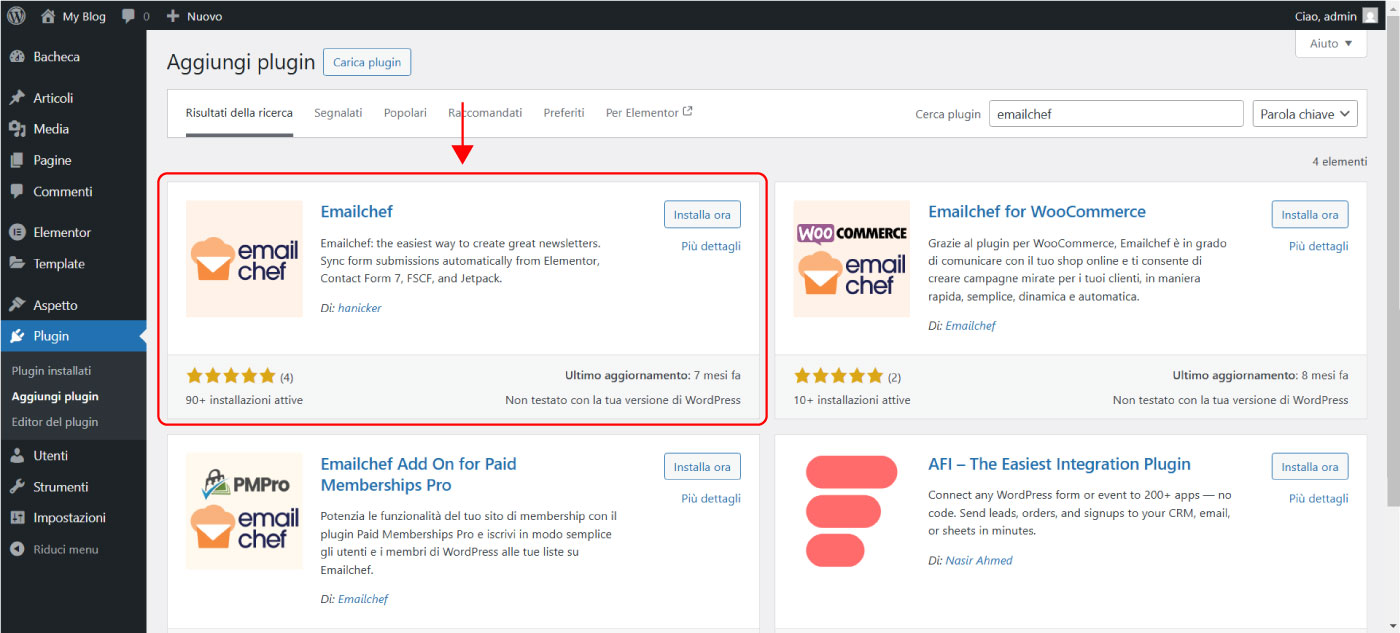 Torna alla tua bacheca WordPress e installa il plugin di Emailchef.