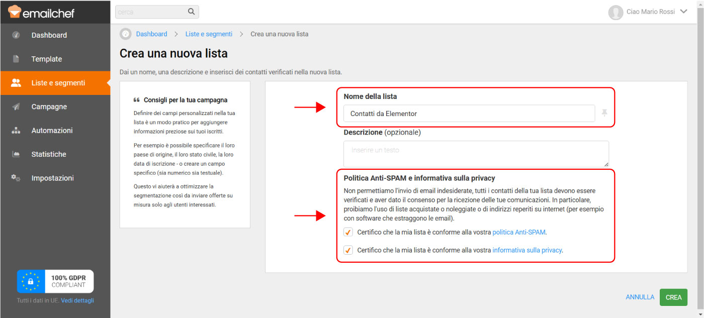 Accedi al tuo account Emailchef e crea una nuova lista di contatti dove verranno aggiunti automaticamente gli iscritti da Elementor.