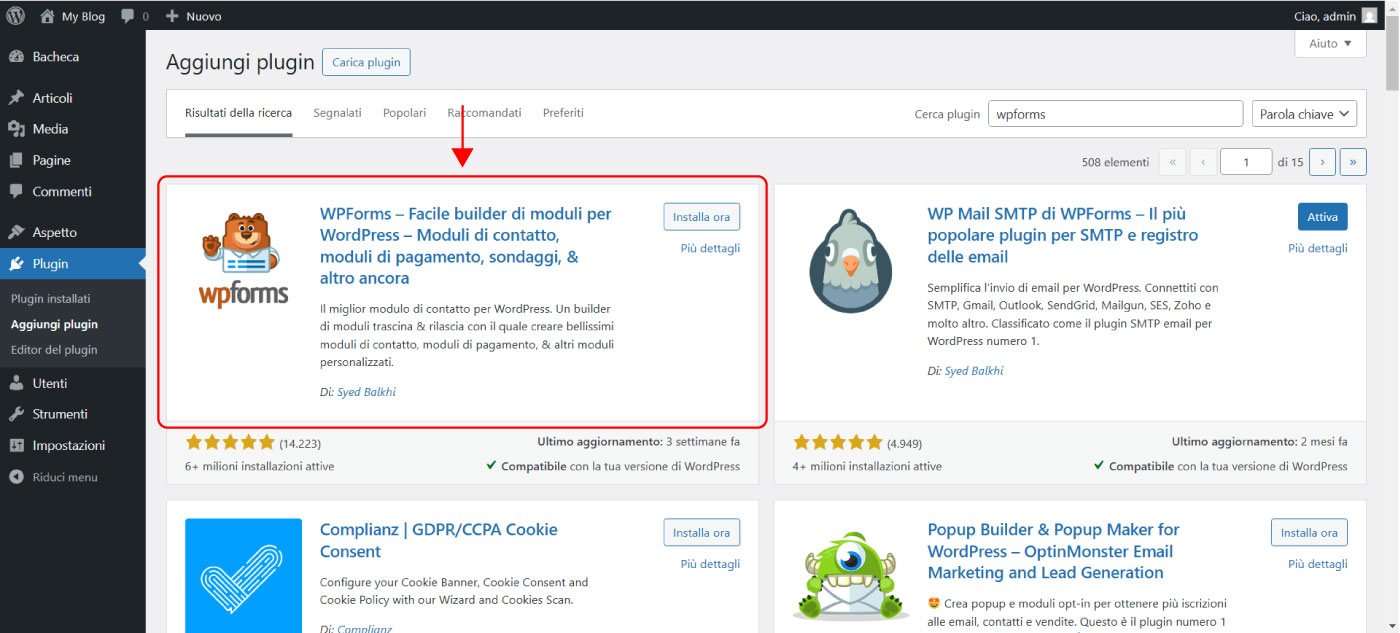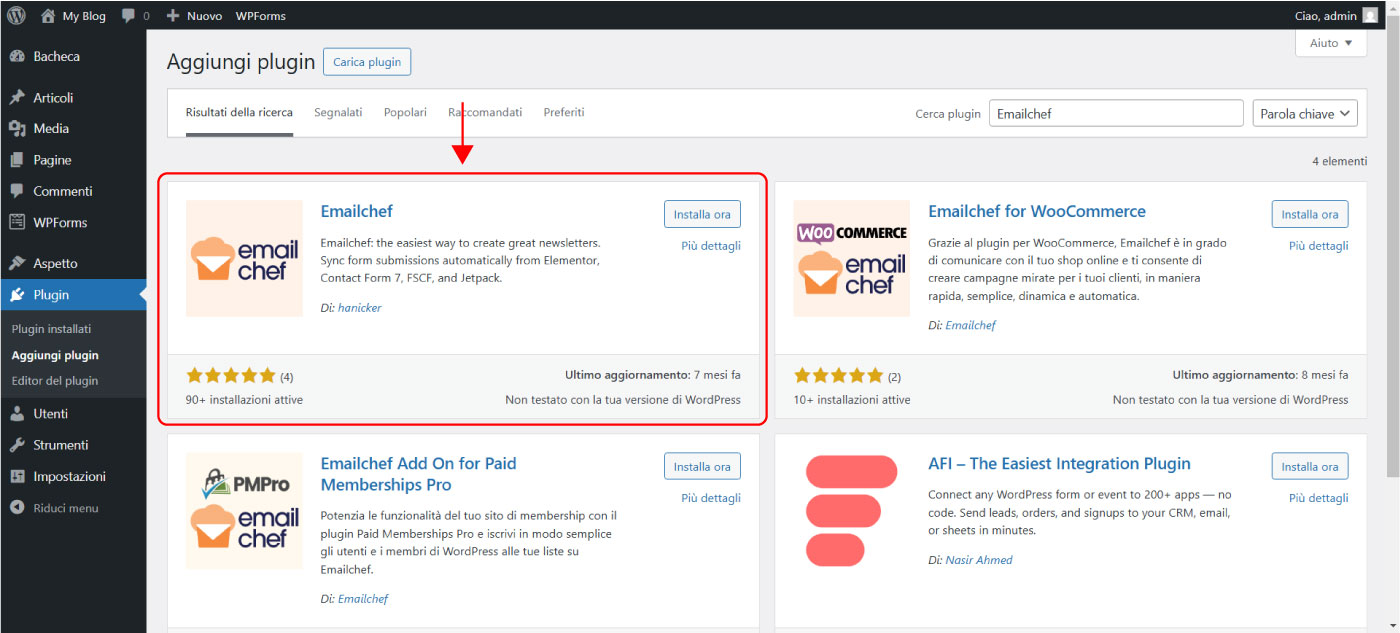 Torna al tuo sito WordPress e installa il plugin Emailchef.