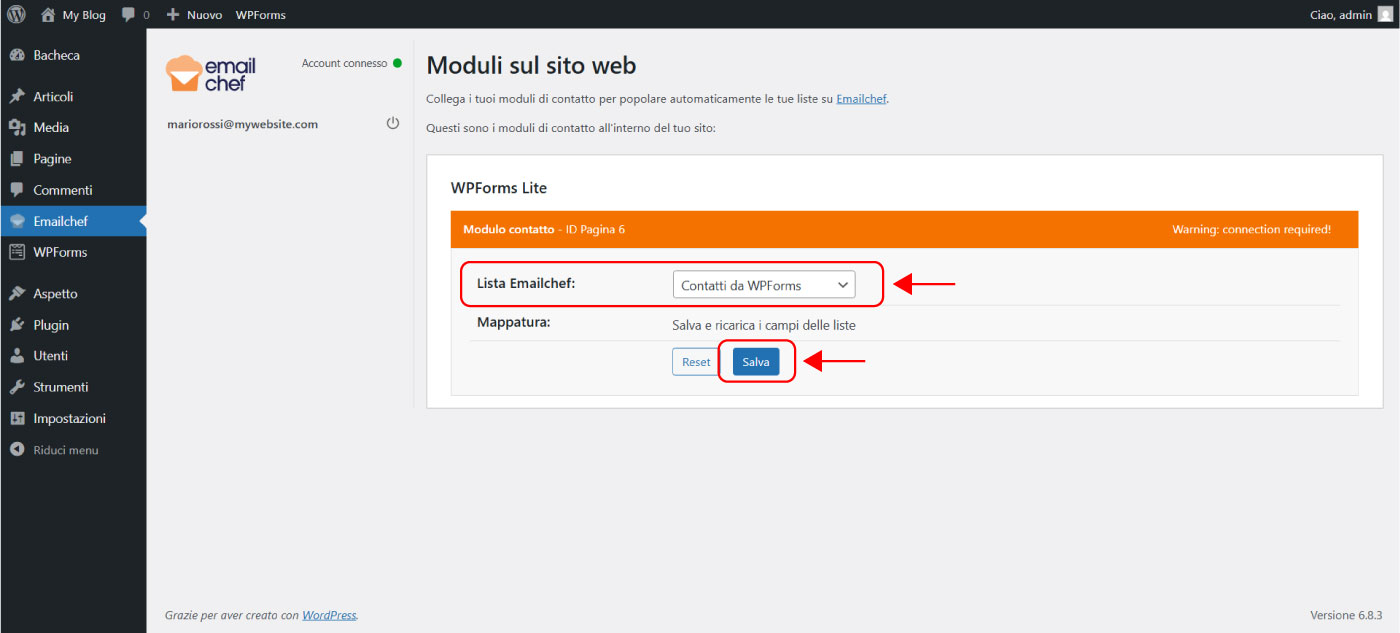 Rendi semplice e automatica la raccolta dei contatti dal tuo sito WordPress: collega i form a Emailchef e trasforma ogni iscrizione in un’opportunità di coinvolgere e convertire.