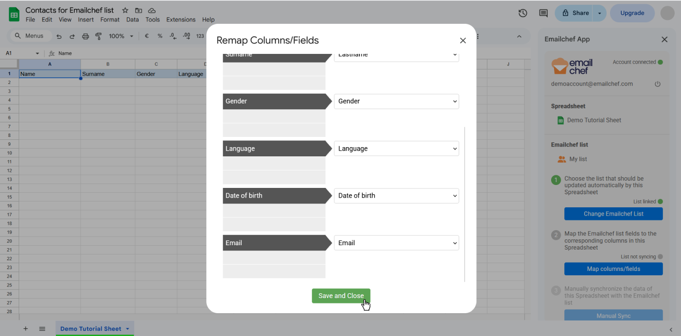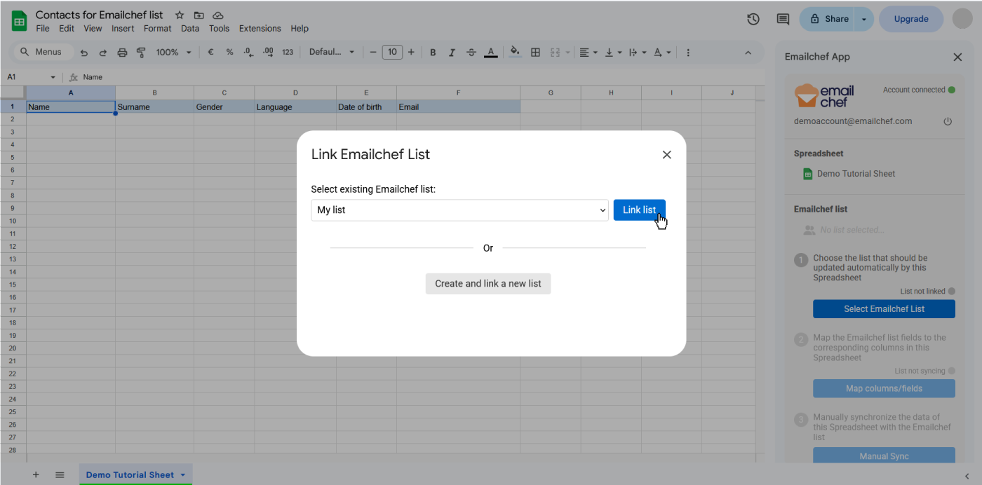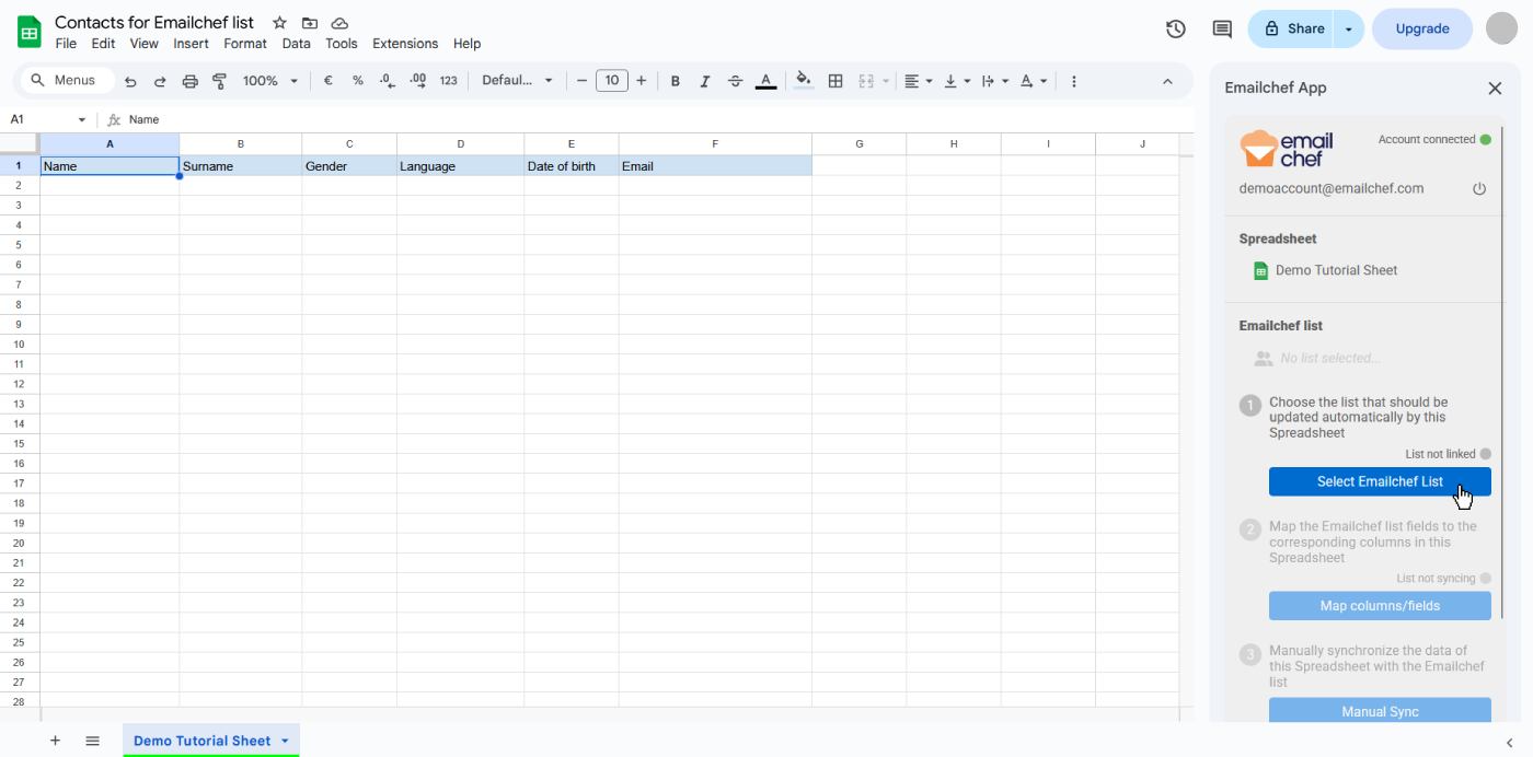 - Sincronizzare i dati in modo semplice: trasferisci in tre passaggi i dati da Google Sheets™ a Emailchef, mantenendo le tue liste sempre aggiornate.