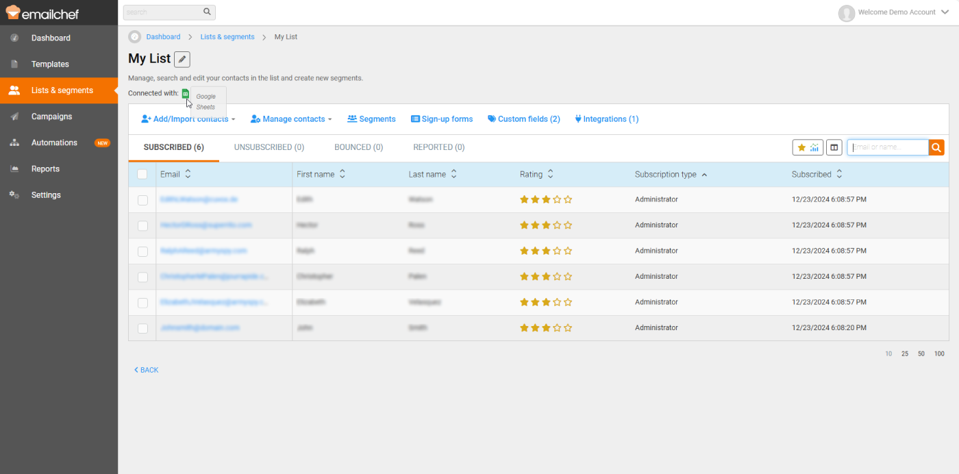 - Trasferire dati verso più liste di contatti: sincronizza più fogli di Google Sheets™ con diverse liste Emailchef, per gestire in modo semplice e personalizzato le tue campagne.