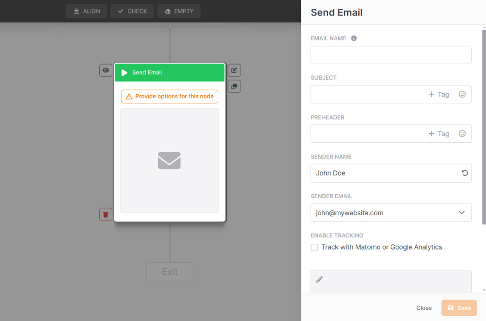 It’s the most straightforward way to deliver welcome messages, promotional content, follow-ups, or transactional emails based on the contact’s journey. This action ensures you can send highly targeted messages at the right time, depending on the path your contacts have taken or the events they’ve triggered.