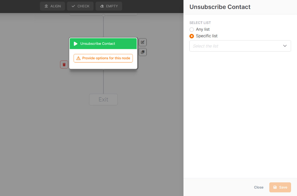 The Unsubscribe contact action allows you to automatically remove a contact from one or more Emailchef lists. It is useful for ensuring that a contact no longer receives communications that are no longer relevant or desired.