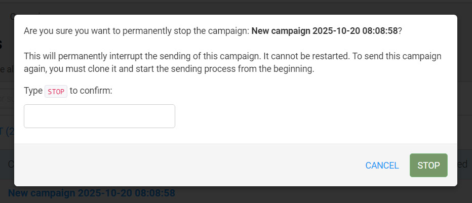 The new ‘Stop Campaign’ feature lets you instantly halt a campaign that is actively sending. Click on Stop Campaign, confirm by typing ‘STOP,’ and the campaign will immediately change its status to Stopped by user.