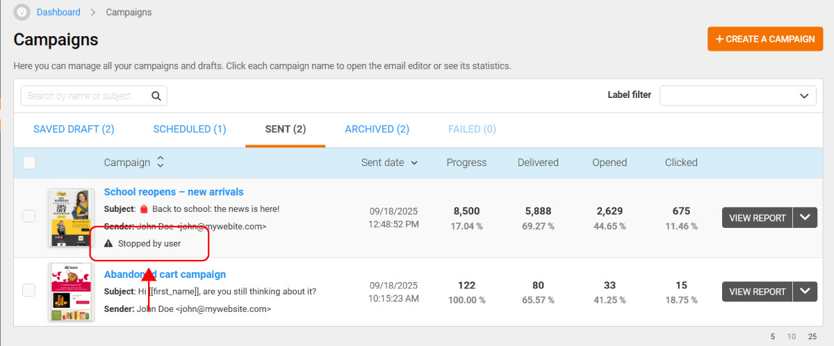 - Sent → Completed campaigns already sent, as well as campaigns manually stopped by the user during sending (Stopped by user).