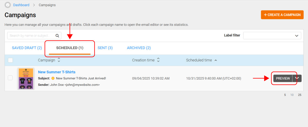 Each campaign has a PREVIEW button: clicking it opens a detailed preview of the campaign, showing the template along with key details such as subject line, sender name, and other settings.